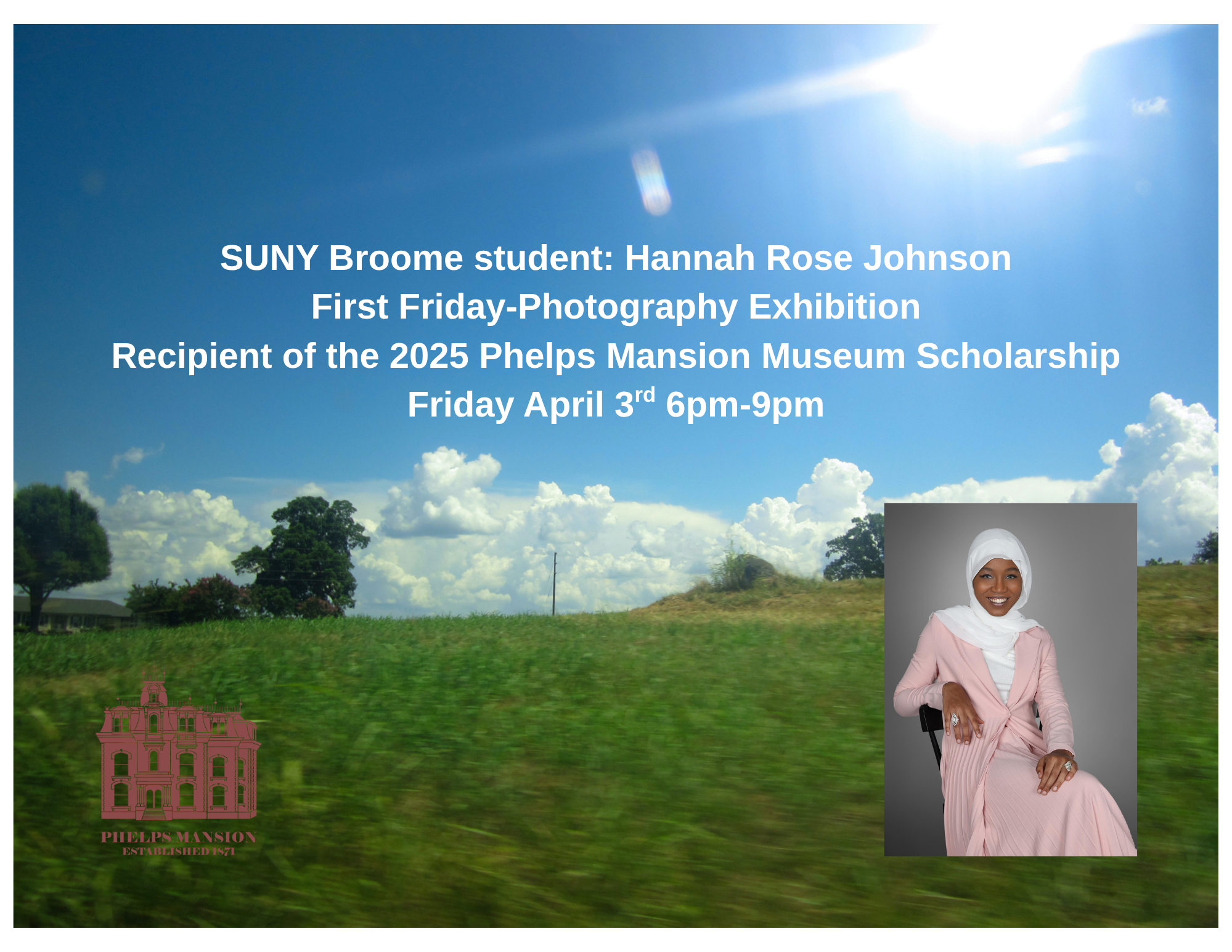 Join the Phelps Mansion Museum for April’s Frist Friday. We will be exhibiting photography of Hannah Rose Johnson. Hannah is the recipient of the 2025 Phelps Mansion Museum scholarship. The