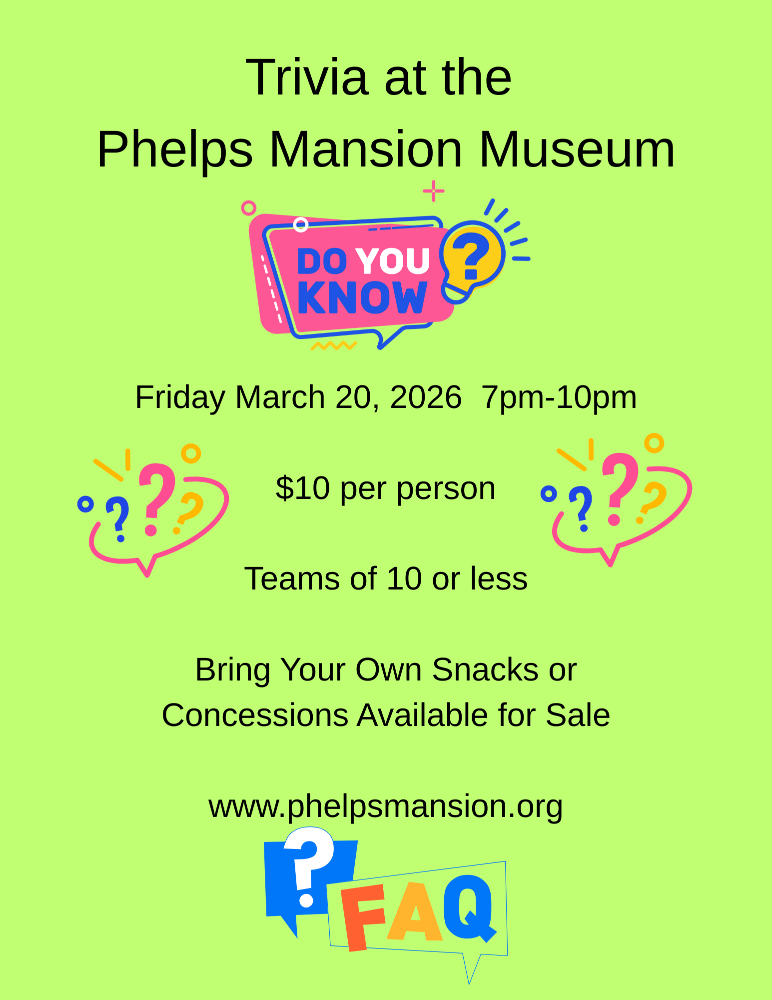 Join the Phelps Mansion Museum for March First Friday. The Mansion will be open for self-guided tours and a scavenger hunt. FREE ADMISSION In our ballroom we welcome back The
