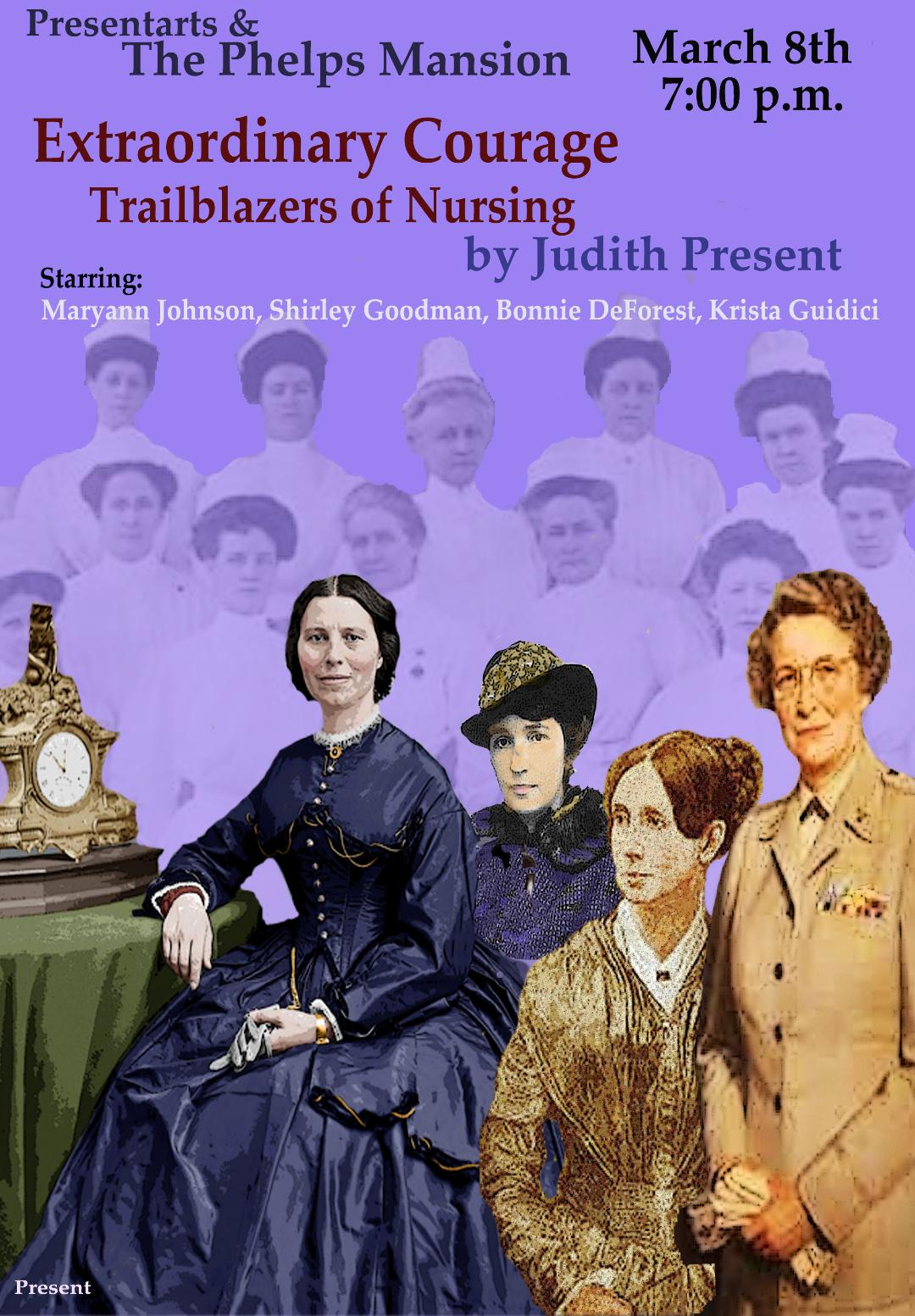 Presentarts and the Phelps Mansion presents “Trailblazers of Nursing” on Mar. 8th at 7 p.m. Written by Judith Present and starring Maryann Johnson, Bonnie De Forest, Shirley Goodman, and Kristin Guidici in a tribute to the Nursing Profession and what it does for us. From the ancient world to the present, women have been vital to the progress of science, yet their importance has been overlooked, and their stories are often lost, distorted or actively suppressed.