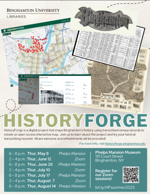 Are you interested in local history and want to help preserve it? Come learn about HistoryForge, a community-sourced digital mapping project hosted by Binghamton University. Community volunteers transcribe census records on the website, which in turn get plotted onto an interactive, digital map. We have started with the 1910 census and are currently transcribing residents in Binghamton’s First Ward, though we hope in the future to incorporate Johnson City, Endicott, and other towns in Broome County. Our free transcription sessions are a great place to meet like-minded history enthusiasts, and food and drinks are provided. Anyone can learn how to do this as long as you have a computer, an internet connection, and the ability to read cursive (or an interest in learning how to do so!). Please make sure to bring your laptop with you to this event.