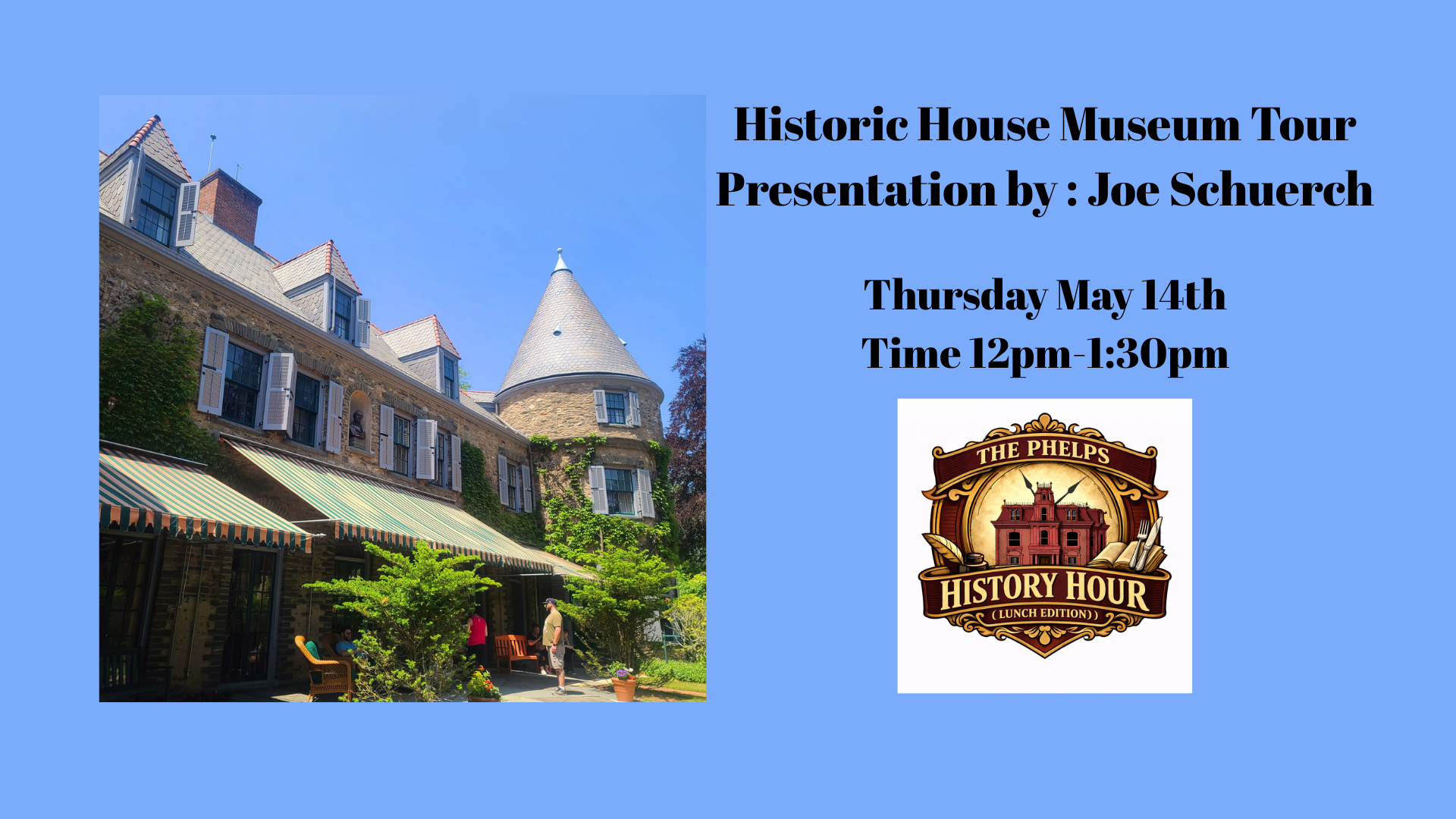 Join us for as we bring back our luncheon programs in a new way. On May 14th our museum educator Joe Schuerch will give a presentation about historic houses he has visited and will share a little of their history.